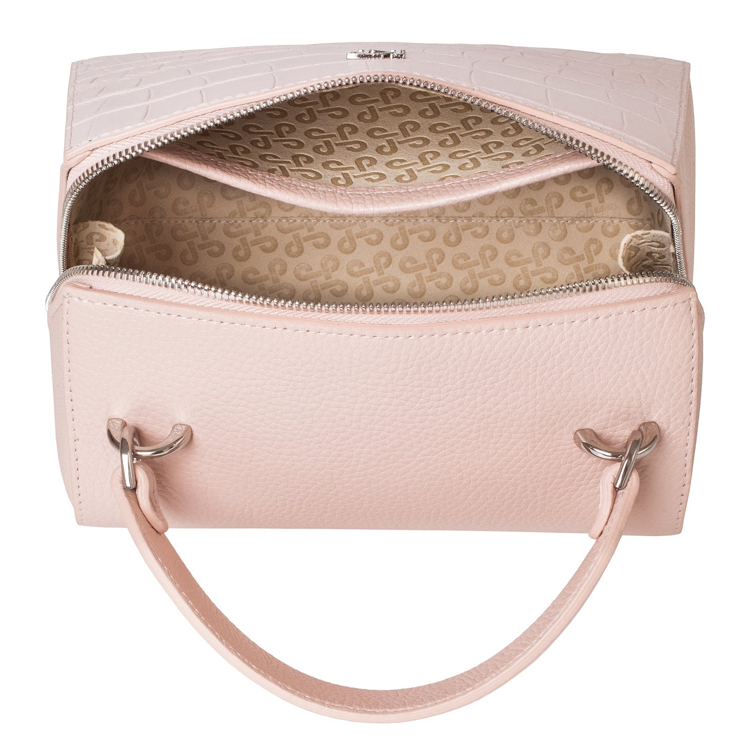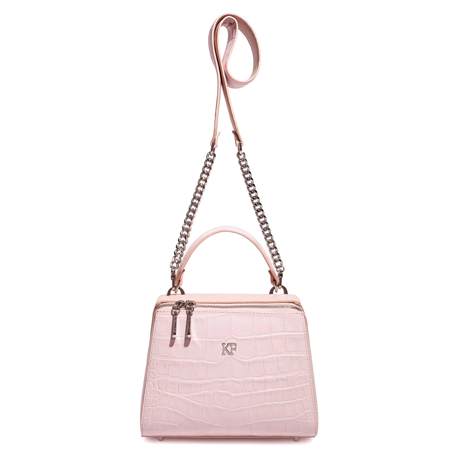 Light pink genuine leather handbag from ukrainian designer Katerina Fox. This model is designed for women who appreciate the sleek design combined with functionality and comfort. High-quality and reliable hardware ensure long service bags. The internal space of a bag is equipped with one spacious compartment and two patch-pockets and one zipper pocket. The bag is closed with a zipper. The bottom of the bag is protected with metal legs. There is a long handle that allows you to wear the bag on the shoulder. The kit also includes a storage bag.